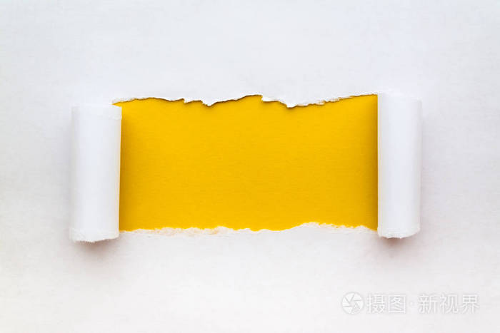 白纸上的一个洞,边缘被撕破,里面有亮黄色的背景纸。好的纸张质感